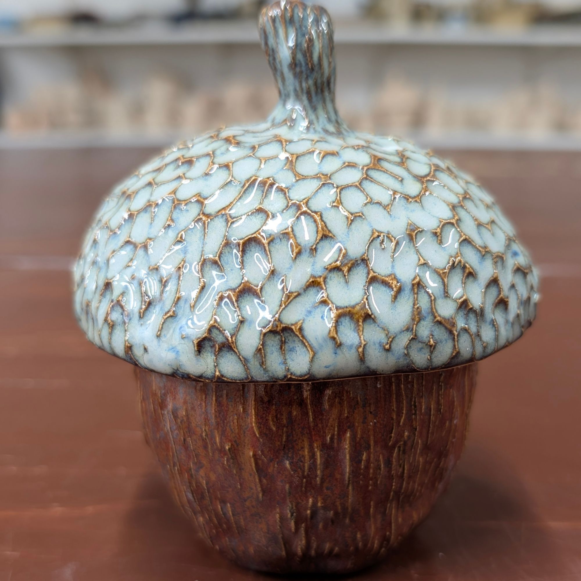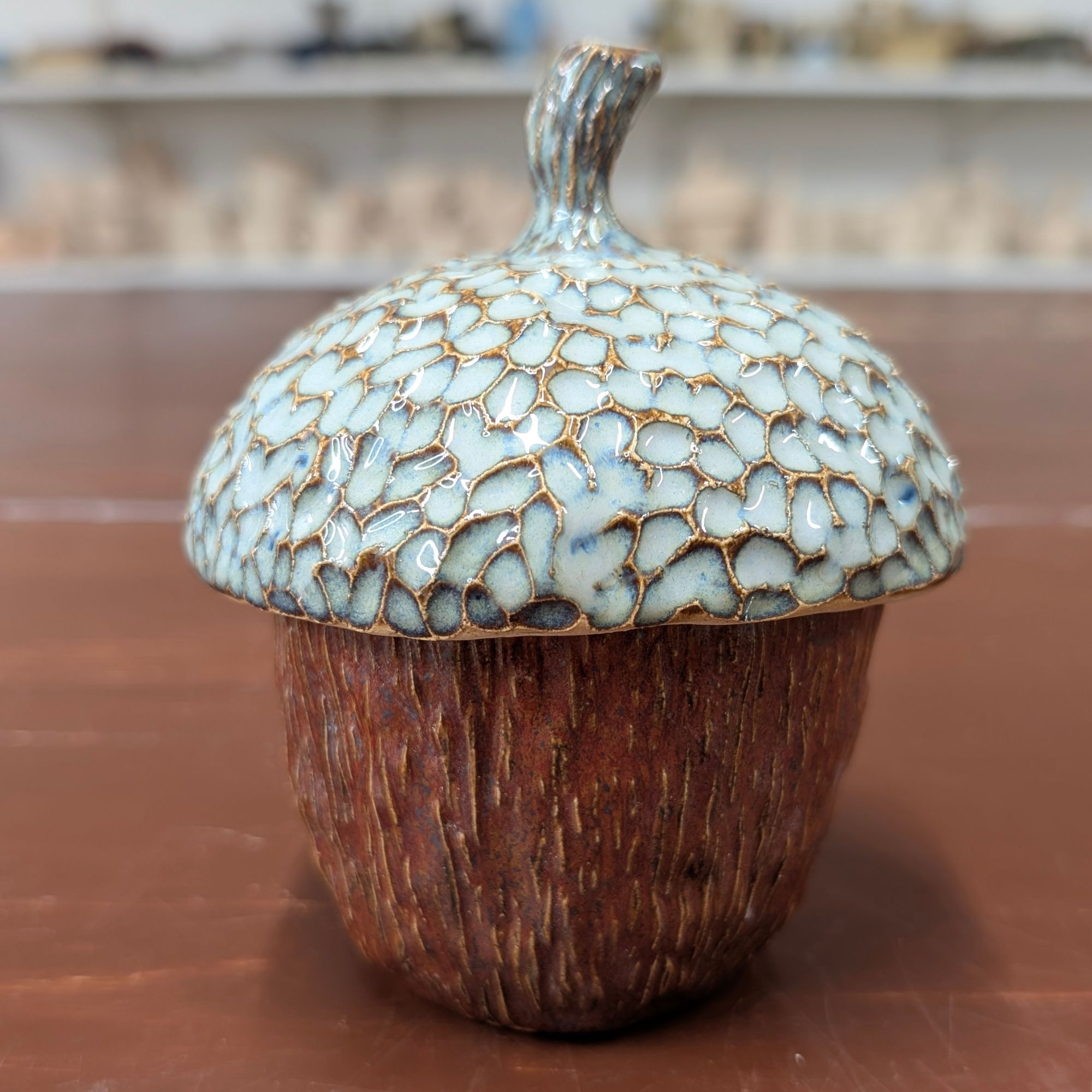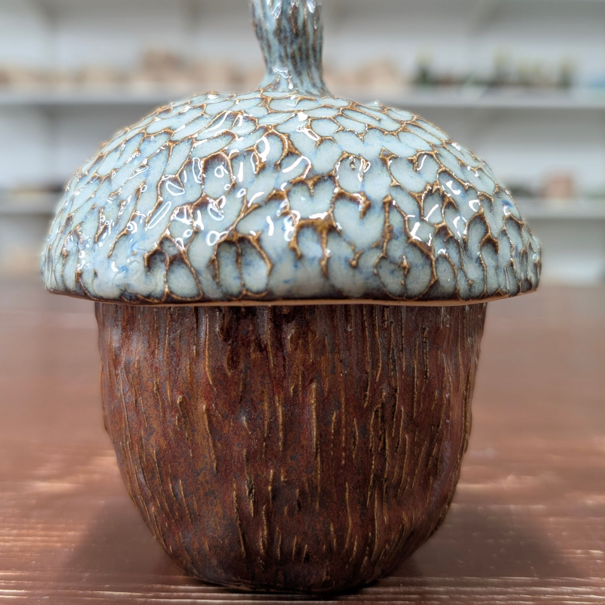 Ten ceramiczny żołądź to mały pojemnik z wielkim charakterem. Dolna część naczynia ma fakturę przypominającą korę czy drewno, w ciepłym brązowym odcieniu. Górę zdobi ręcznie szkliwiona przykrywka z efektowną, pękającą strukturą szkliwa w delikatnym, jasnym kolorze - niczym czapeczka prawdziwego żołędzia.